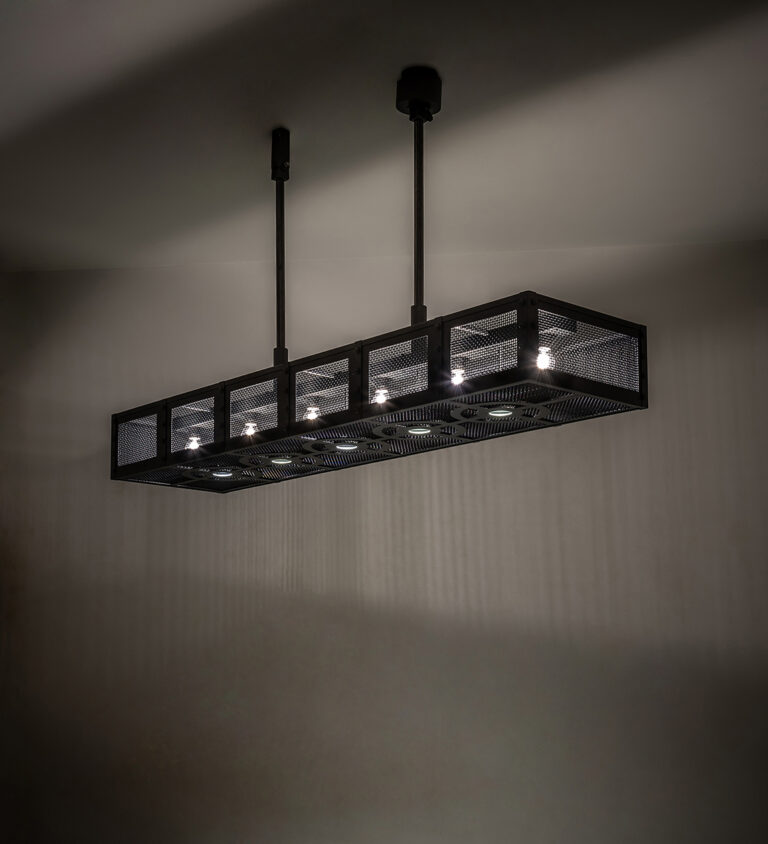 Modern industrial chandeliers are inspired by classic factory and warehouse lighting, incorporating rugged, durable materials such as steel and iron with contemporary elements. 50″ Wide