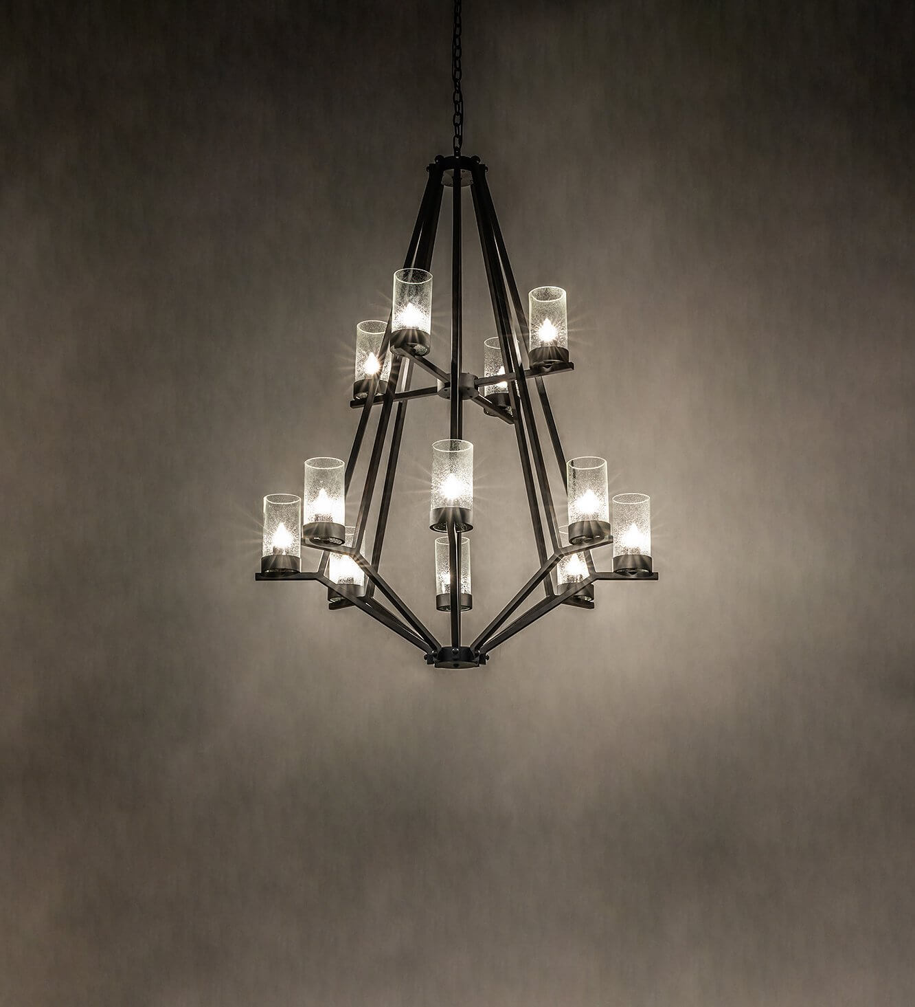 An architectural-style structure featuring an elaborate custom-built frame. The fixture is adorned with 12 Clear Seeded Glass Cylindres that illuminate from bobeches. The chandelier is featured in a Chestnut finish. The overall height ranges from 63 to 254 inches, as the chain length can be easily adjusted in the field to accommodate your specific lighting application needs. The fixture is ideal for illuminating entryways and dining spaces in fine homes, restaurants, and hotels. The Galen Chandelier is part of our American-made, American-designed, handcrafted Transitional Lighting Collection, manufactured in Yorkville, New York. The fixture is UL and cUL listed for dry and damp locations.