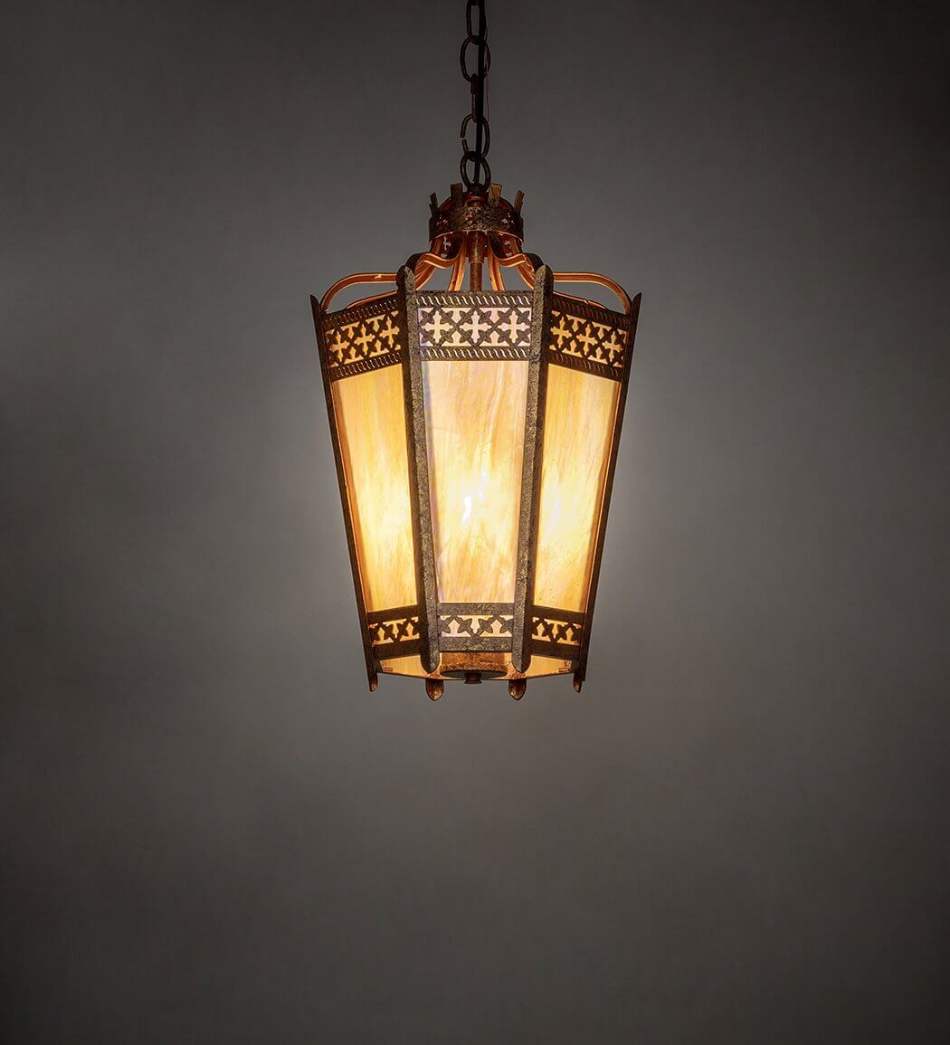 Offering a blend of timeless craftsmanship and classic design. Cardiff boasts unsurpassed quality and a shapely appeal. The Beige Iridescent Glass shade features stunning Gothic-style and Saltire Cross accents. Cardiff is enhanced with a dramatic design and frame offered in an Autumn Leaf finish. The exquisite chandelier beautifully illuminates dining areas and entryways in fine homes and restaurants. The overall height of this pendant ranges from 66 to 137 inches, as the chain length can be easily adjusted on location to accommodate your specific lighting application needs. The Cardiff Pendant is part of our American-made, American-designed, handcrafted Gothic Lighting Collection, manufactured in Yorkville, NY. The fixture is UL and cUL listed for dry and damp locations.