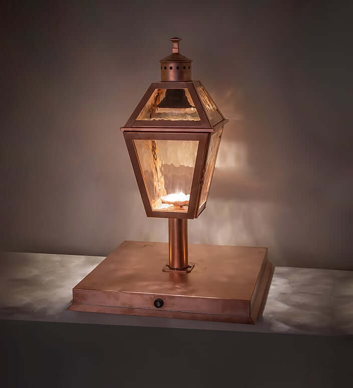 A timeless design combines classic styling and hand-craftsmanship to create the regal Corrina Lantern Post Mount for fine interiors and exteriors. The Rose Gold Art Glass Lens reveals a lamp that provides beautiful ambient lighting from within the lantern. The frame, decorative accents, and hardware are featured in Raw Copper and Clear Gloss finishes. The fixture is ideal for placement on posts and columns on decks and patios in timber homes, modern farmhouses, and other spaces. The fixture is designed with a door that opens for cleaning and maintenance, as well as a photocell sensor that turns on the outdoor light at Dusk and off at Dawn. The Corrina Post Mount is included in our American-made, American-designed, handcrafted Traditional Lighting Collection. The fixture is manufactured in Yorkville, New York. It is UL and cUL listed for dry, damp, and wet locations.