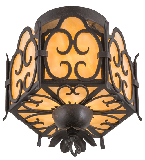 Dramatic elegant scroll designs are highlighted on six side panels and the bottom diffuser of this beautiful pendant, which is featured in stunning Beige art glass. The scrolls, decorative accents and matching hardware are all featured in an exquisite Chestnut Textured finish. Handcrafted in the USA, this pendant is available in custom sizes, styles and colors, as well as dimmable energy efficient lamping options. This fixture is UL and cUL listed for dry and damp locations.