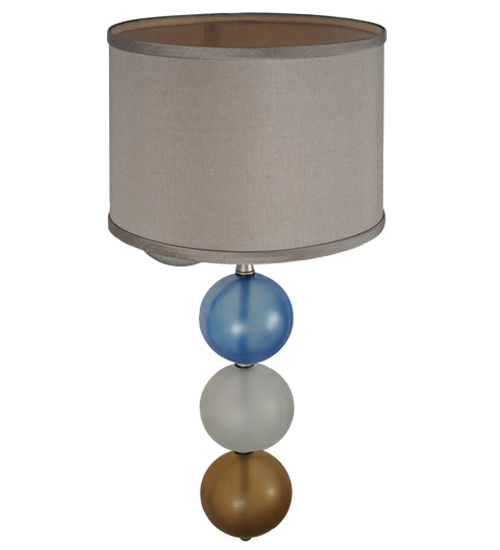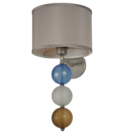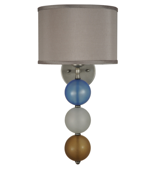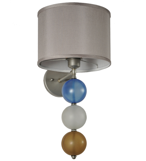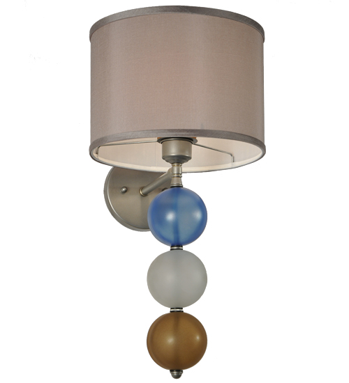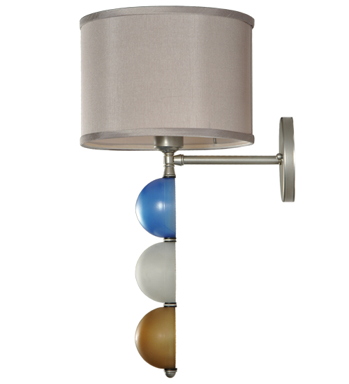 This unique wall sconce combines a Nickel finished suspension rod that embrace three Smokey Blue, White and Amber Glass orbs and is crowned with a Textrene shade. This stunning wall fixture is perfect for placement in corridors and other areas in residential and hospitality settings from Newport, Rhode Island, to Boca Raton, Florida. The Charmz Wall Sconce is included in our American-designed, handcrafted Art Deco Lighting Collection. UL and cUL listed for dry and damp locations however we do not recommend installing it in spaces that experience a large amount of moisture due to the fabric shade.
