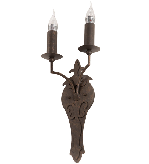 An elegant wall sconce. Torsade includes 2 GU10 base LED Decorative Flametip Candelabra bulbs that comply with California Title 24 regulations. At the time of this writing is the only source in the world for this type of energy efficient bulbs today. These bulbs are featured on faux candlelights that are offered in a Gilded Tobacco finish. The exquisite frame, decorative accents and backplate are featured in a matching finish. Custom crafted by highly skilled artisans in our 180,000 square foot manufacturing facility in Yorkville, NY. Custom sizes and finishes available. UL and cUL listed for dry and damp locations.