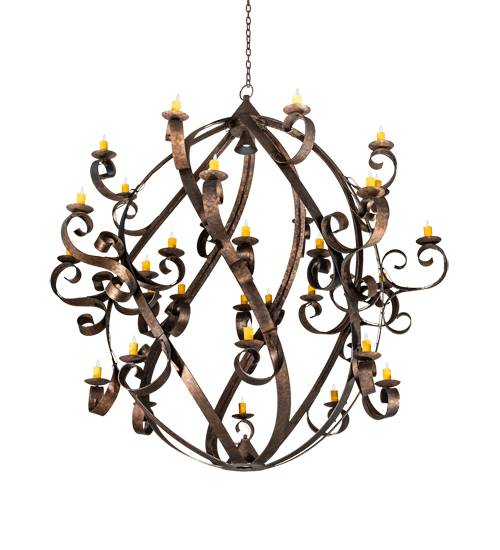 A massive, magnificent chandelier with an elegant presence. The prodigious Caliope is the Winner of Best of 2019 for Decorative Lighting from EnLIGHTenment magazine. The fixture is adorned with 32 Amber faux candlelights perched on delicate bobeches embraced by Hand-Forged Iron Scrolled arms, plus two functional downlights that highlight the texture of the body. The decorative accents and hardware are featured in a classic Rococco finish. The overall height ranges from 101 to 172 inches as the chain length can be easily adjusted in the field to accommodate your specific lighting application needs. Handcrafted in our 180,000 square foot manufacturing facility in Yorkville, NY. UL and cUL listed for damp and dry locations.