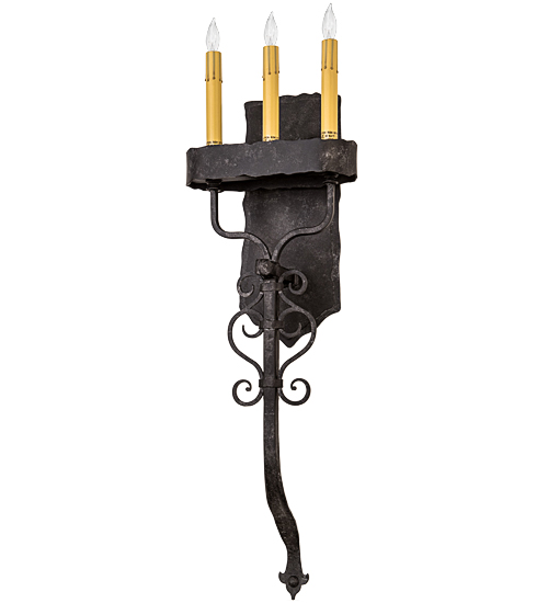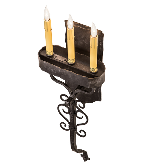 Decorative and enchanting, rich charm and rustic elegance come to light with the Ahriman wall sconce which is designed as a dramatic accent for a hallway, entryway or any other room. The sconce features 3 Amber faux candlelights perched on a Gothic styles frame with Hand-forged Iron hardware and Scrollwork featured in a Smoke finish. Handcrafted by highly skilled artisans in our Upstate New York manufacturing facility, this rustic fixture is available in custom sizes, styles, colors and dimmable energy efficient lamping options such as LED. The 10-inch wide wall fixture is UL and cUL listed for damp and dry locations.