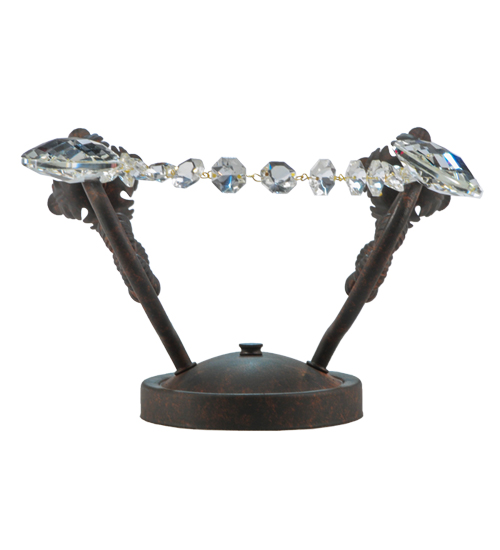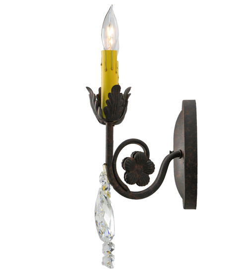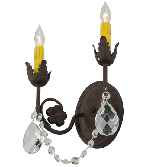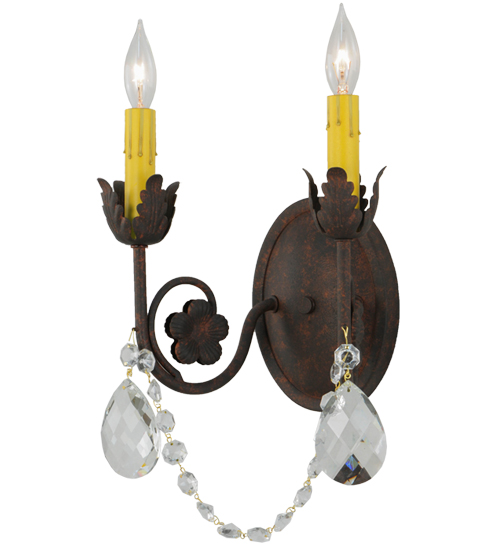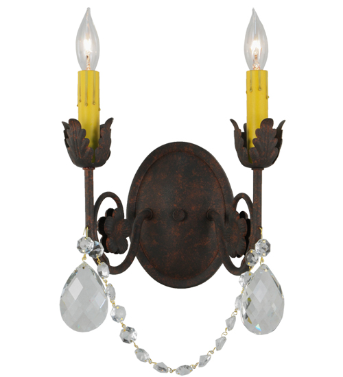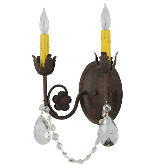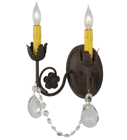 Exquisite styling and luxurious charm are reflected in these faceted crystal charms, scroll arms, Acanthus leaves and rich Rusty Nail finished hand-forged hardware. This elegant wall sconce embraces 2 matching faux candlelights. This wall fixture features hand detailed American craftsmanship perfected by years of time honored artistry, passed down from generations of highly skilled artisans. Custom sizes, styles, colors and dimmable energy efficient lamping options such as LED are available. The fixture is UL and cUL listed for damp and dry locations.
