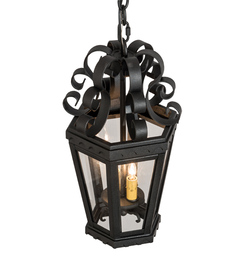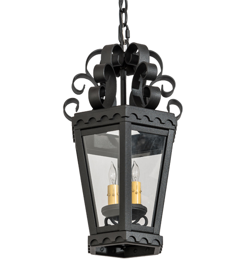 The sophisticated upscale Cadenza lantern is designed with elaborate scroll details and brilliant elegance. Custom crafted of Hand-forged iron with a Black powder coat finish and complemented with 4 panels of Crystal Idalight that reveal 4 Amber faux candlelights which illuminate with Customer-supplied candelabra lamps. Designed with high-style appeal, the fixtures are used for beautiful ambient lighting in corridors, porches, entryways and other residential and commercial spaces. Handmade by highly skilled artisans in our 180,000 square foot manufacturing facility in Yorkville, New York. Available in special sizes, designs and finishes. UL and cUL listed for dry and damp locations.