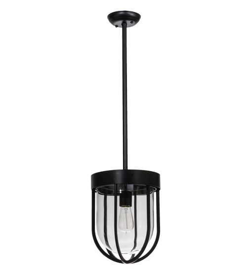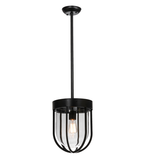 Although the bulb appears caged, the illumination and unique aesthetic appeal are not. Hand finished in Solar Black the inverted frame and hardware house an Edison A19 incandescent within a Clear glass dome. A unique simplistic design. Handcrafted by highly skilled artisans in our manufacturing facility in Yorkville, NY. Custom styles, sizes and colors available.