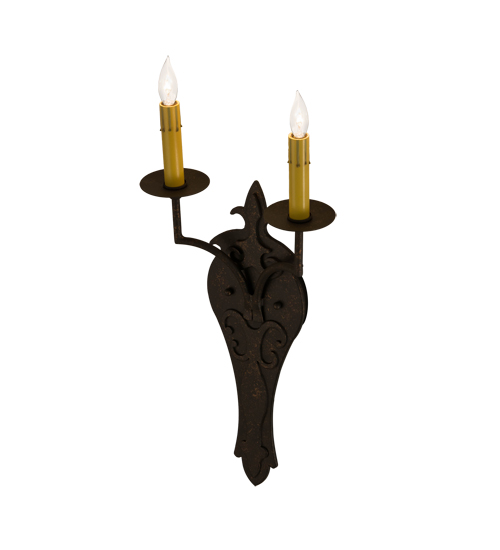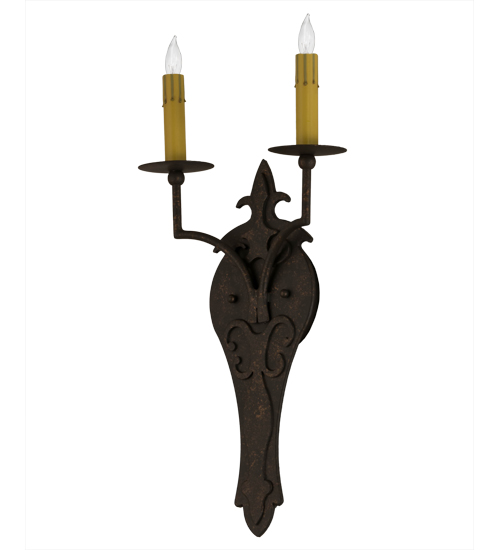 Ornate hand-forged metalwork and a medallion styled backplate create a rich, luxurious look for Torsade. This high-styled wall fixture features twin Amber faux candlelights perched on bobeches and enhanced with a stylized accents featured in a Gilded Tobacco finish. This sconce is ideal to complement a variety of architectural styles for today’s interiors. Custom crafted in the USA, this fixture is offered in custom sizes, finishes and styles, as well as energy efficient lamping options such as LED. This wall luminaire is UL and cUL listed for damp and dry locations.