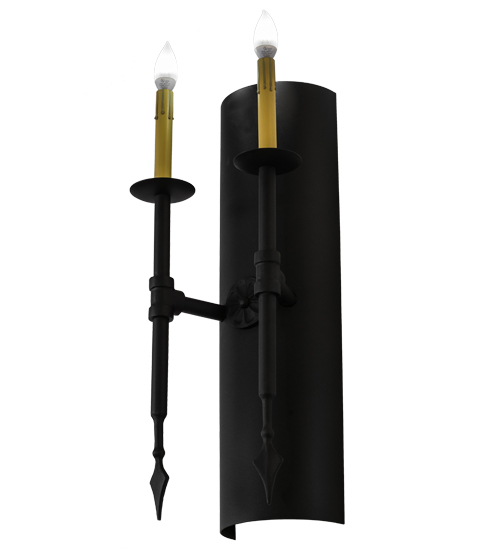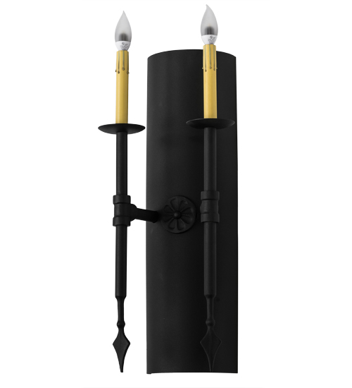 Welcome a handsome transitional look into your home or business with the stunning Warwick wall sconce, which integrates a distinctive motif with classic styling. Two faux Amber candlelights, perched atop bobeches embraced on a curved backplate, provide beautiful ambient lighting using customer-supplied 3-watt LED lamps which feature energy savings, reduced maintenance and long life. Designed with spear tip accents in a Black Textured finish, Warwick completes an evocative impression. Custom crafted in our 180,000 square foot manufacturing facility in Yorkville, New York. Available in custom finishes, sizes and colors, as well as dimmable lamping options. The wall luminaire is UL and cUL listed for damp and dry locations.