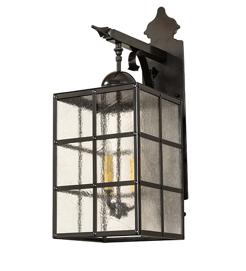 The handsome Baretta wall sconce features a striking windowpane design with a Gothic look. The classic lantern embodies a Clear Seeded Glass lens that reveals three Ivory faux candlelights. The shade features a rugged arm, scrolled accents hardware, and a frame in a stunning Exterior Oil Rubbed Bronze finish. The fixture is ideal for placement indoors and outdoors in residential and hospitality locations from Springfield, Massachusetts, to Springfield, Illinois, to Springfield, California. The Baretta Wall Sconce is included in our American-made, American-designed, handcrafted Gothic Lighting Collection and manufactured in Yorkville, New York. UL and cUL are listed for dry, damp, and wet locations.