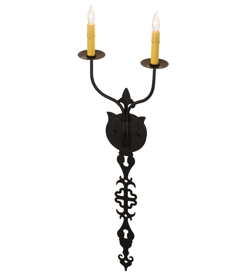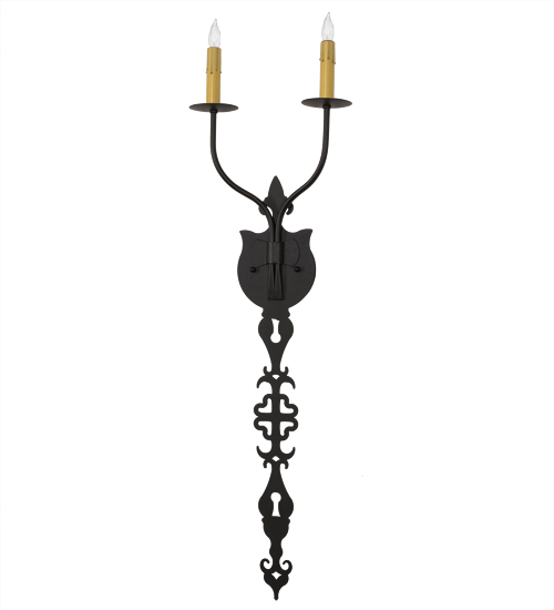 Ornate Hand-forged Iron Scrollwork and a medallion styled backplate create a rich, luxurious look for Merano. This high-styled wall fixture features two Ivory faux candlelights perched on bobeches and enhanced with an Old Wrought Iron finish. This ADA Compliant sconce complements a variety of architectural styles for today’s interiors. Custom crafted by highly skilled artisans in our 180,000 square foot manufacturing facility in Yorkville, New York. Candlelight colors, metal finishes and pendant sizes can be customized. UL and cUL listed for dry and damp locations.