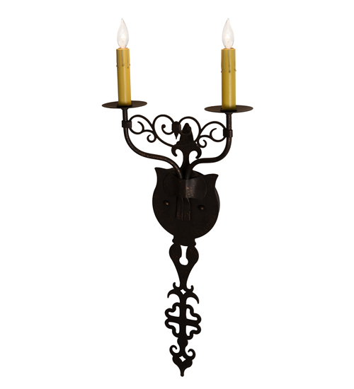 Ornate Hand-forged Iron Scrollwork and a medallion styled backplate create a rich, luxurious look for Merano. This high-styled wall fixture features two Ivory faux candlelights perched on bobeches and enhanced with a Gilded Tobacco finish. This ADA Compliant wall sconce is ideal to complement a variety of architectural styles for today’s interiors. Custom crafted by highly skilled artisans in our 180,000 square foot manufacturing facility in Yorkville, New York. Candlelight colors, metal finishes and pendant sizes can be customized. UL and cUL listed for dry and damp locations.