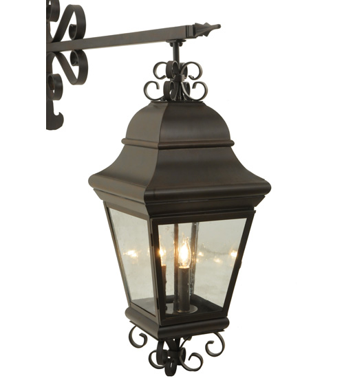 Taking rich elegance to an entirely new level. Monaco features a Clear Seeded Glass lantern suspended by a scroll accented spear-shaped arm. The shade reveals 3 complementary faux candelights that are handpainted to match the hardware and frame featured in a Coffee Bean finish. This lovely steel wall sconce is ideal for fine interior and exteriors. Handcrafted in our 180,000 square foot manufacturing facility in Yorkville, New York. The fixture is available in custom sizes, styles and finishes. UL and cUL listed for dry, damp and wet locations.