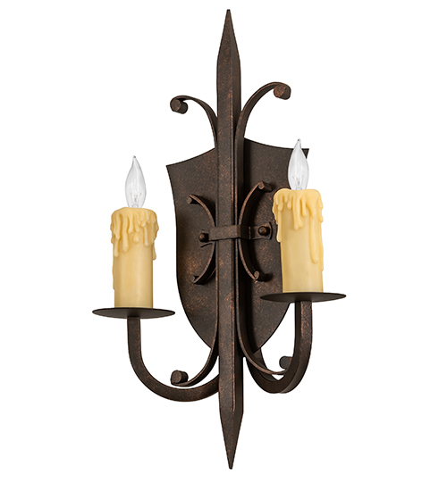 Rustic charm and elegance come to light with the Shield sconce, which is designed as a dramatic wall luminaire for any room or corridor. The ADA Compliant fixture features 2 Ivory faux candlelights which are perched on bobeches and enhanced with dramatic Gothic styled accents to match the shield-like backplate. Hardware and decorative accents are featured in a Gilded Tobacco finish. Handcrafted by highly skilled artisans in our Upstate New York manufacturing facility, this Hand-forged Iron fixture is available in custom sizes, styles, colors and dimmable energy efficient lamping options as well as LED. The 11-inch wide sconce is UL and cUL listed for dry and damp locations.