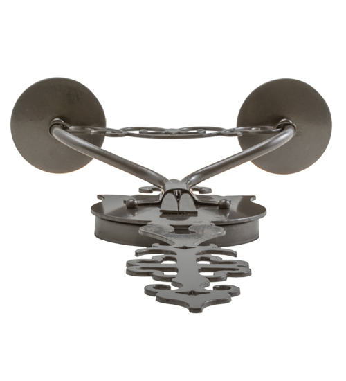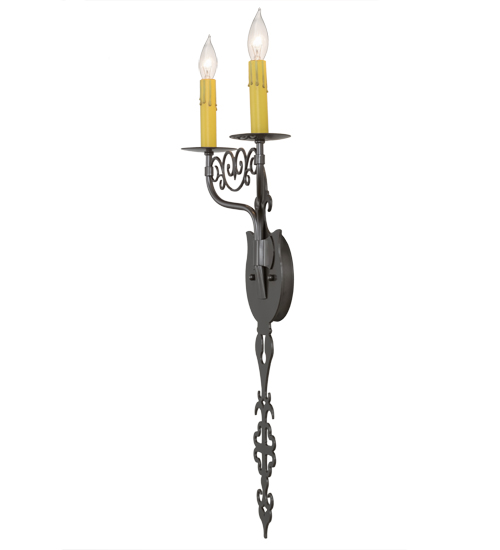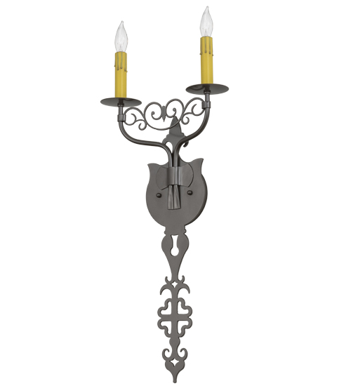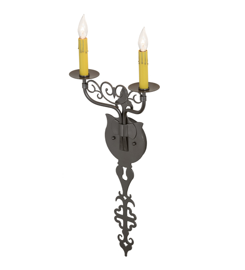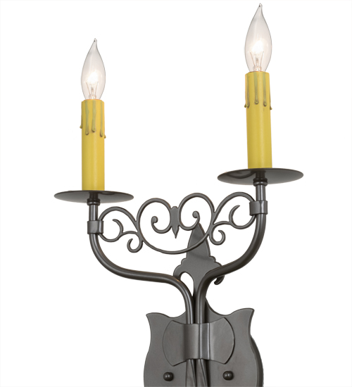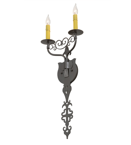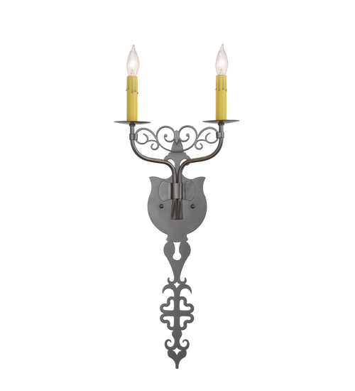 Ornate hand-forged scrollwork and a medallion styled backplate create a rich, exquisite look for Merano which was inspired by Medieval French architectural styling. This unique wall fixture features 2 Amber faux candlelights perched on bobeches and enhanced with decorative accents in a Bronze Metallic finish. This sconce is ideal to complement a variety of today’s interiors. Custom crafted in our 180,000 square foot manufacturing facility in the USA, this wall fixture is offered in custom sizes, finishes and styles, as well as energy efficient lamping options. The 11-inch wide sconce is UL and cUL listed for damp and dry locations.