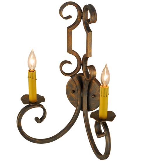 Exquisite styling and luxurious charm are reflected in this decorative wall sconce. Carlo renders an elegant design adorned with scrollwork and hardware in a French Bronze finish. This sophisticated sconce renders 2 Amber faux candlelights perched on delicate bobeches and designed for beautiful ambient light. Custom sizes, styles and colors are available, as well as dimmable energy efficient lamping options. This 18-inch tall fixture is UL and cUL listed for damp and dry locations.