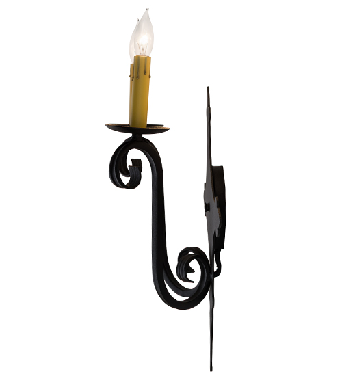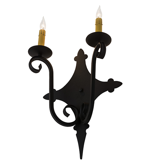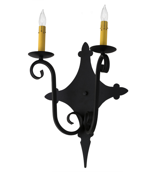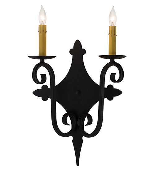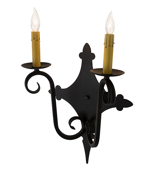 Rich charm and elegance come to light with Angelique, a wall sconce designed as a dramatic accent for a hallway, entryway or any other room. This enchanting wall fixture features two Ivory faux candlelights perched on bobeches with scrolled arms and hand forged Iron hardware featured in a Textured Black finish. Handcrafted in our 180,000 square foot manufacturing facility in Yorkville, New York. Custom colors, styles and sizes are available, as well as dimmable energy efficient lamping options such as LED. UL and cUL listed for damp and dry locations.