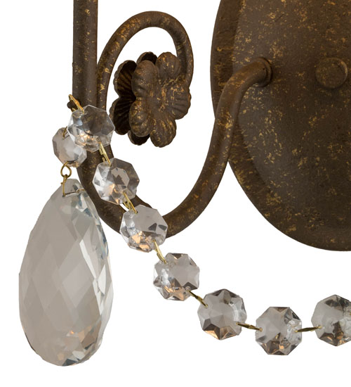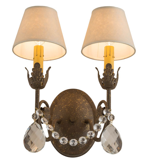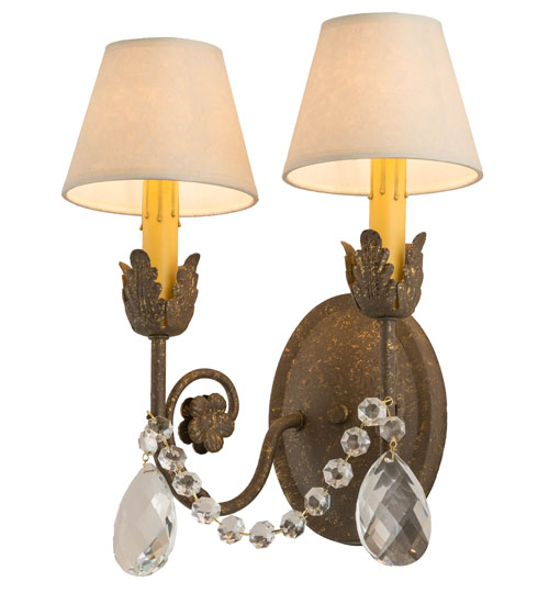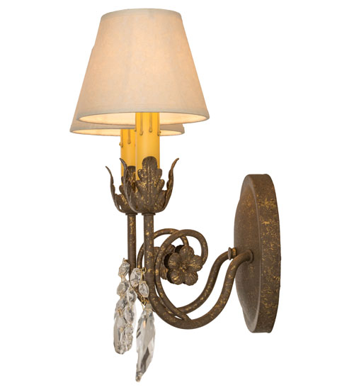 Exquisite styling and luxurious charm are reflected in the Antonia Wall Sconce, adorned with two Ivory faux candlelights crowned with White Linen shades. The shades are perched on floral bobeches with Hand-forged Iron scrolled arms in an Autumn Leaf finish and enhanced with Crystal droplet accents. The fixture features quality materials and hand-detailed American craftsmanship perfected by years of honored artistry. The Antonia Wall Sconce is included in our American-made, American-designed, handmade Traditional Lighting Collection and manufactured in Yorkville, New York. UL and cUL listed for dry and damp locations; however, we do not recommend installing it in spaces that experience a large amount of moisture due to the fabric shades.