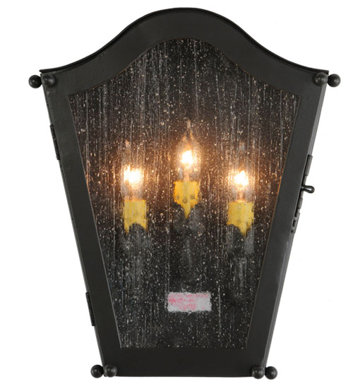 A lovely curvaceous lantern wall sconce, Austin features Clear Seeded Glass that reveals three handpainted Acanthus leaf accented candle covers with Customer-supplied candelabra lamps. The graceful frame and hardware are offered in a stunning Timeless Bronze finish. Handcrafted by highly skilled artisans in our manufacturing facility in Yorkville, NY, this wall sconce is available in custom shapes, designs, colors and sizes. Dimmable energy efficient lamping options such as LED are offered. The 14-inch tall fixture is UL and cUL listed for dry, damp and wet locations.