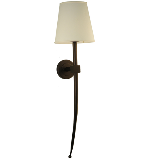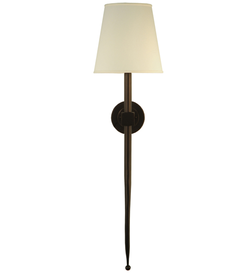 A sleek but heavy statement sconce for a large space. This wall fixture features a Eggshell Textrene shade perched atop of a custom tailored bobeche accented with a long slender decorative stem embellished with a ball tip for a high level of aesthetic appeal. A charming round backplate and hardware are hand finished in an Mahogany Bronze. Ideal for hallways, foyers and other spaces in homes, restaurants, pubs, hotels and other fine interiors. The fixture is custom crafted by artisans in our 180,000 square foot manufacturing facility in Yorkville, New York. UL and cUL listed for dry and damp locations however we do not recommend installing it in spaces that experience a large amount of moisture due to the fabric shades.
