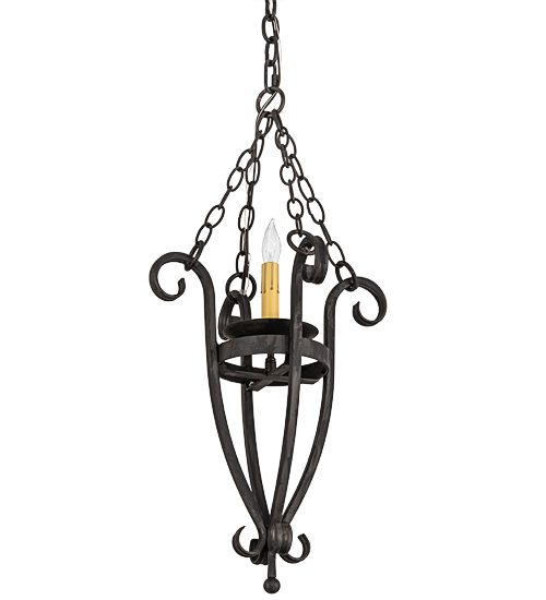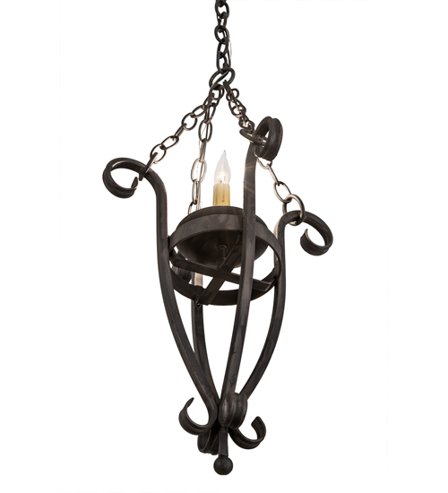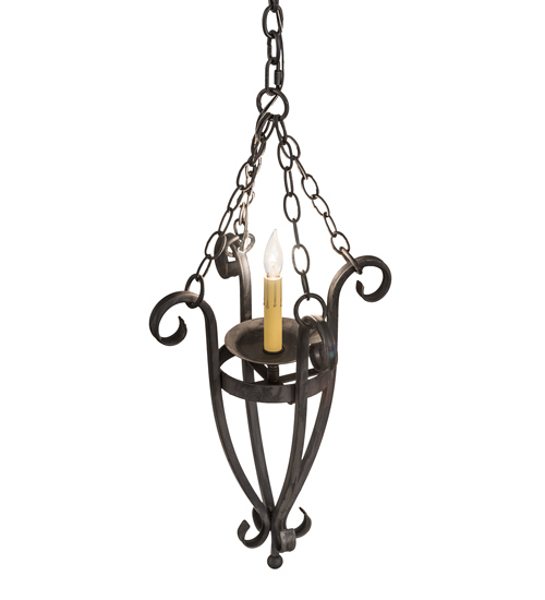 Elegance with a rustic touch. A Wrought Iron finished frame defines this exquisite ceiling pendant. An Ivory faux candlelight illuminates while embraced by a bobeche attached to a sturdy frame with hardware featured in a matching finish. Overall height ranges from 31 to 127 inches as the chain can be easily adjusted in the field. The Costello Pendant is included in our American made, American designed handcrafted Rustic Lighting Collection. Manufactured in Yorkville, New York. UL and cUL listed for dry and damp locations.