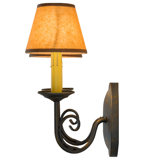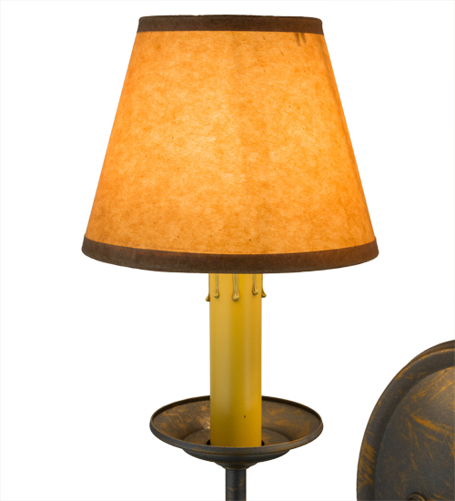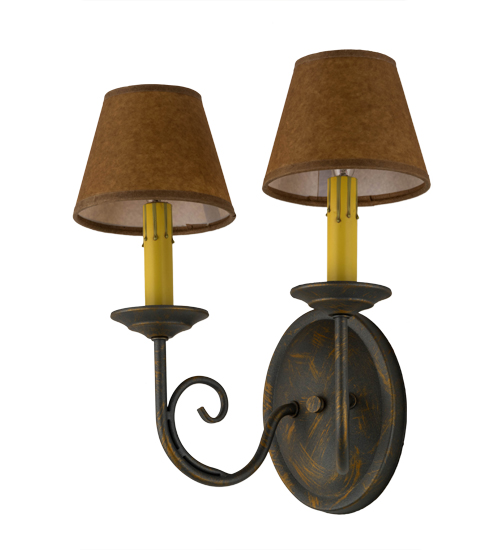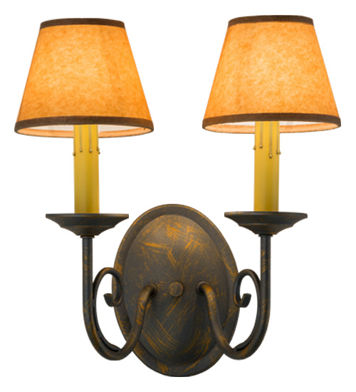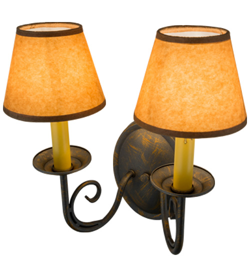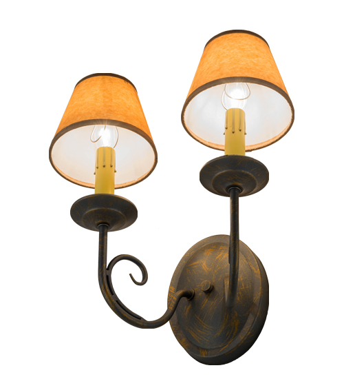 A sumptuous decorative design evokes a rich lustrous charm. Jenna features a French Bronze finish that will highlight the walls of any room. Hand-Forged Iron scrollwork and bobeches embrace 2 Amber faux candlelights topped with Parchment shades. The fixture will add a touch of warm ambient lighting to your interiors. Handcrafted by highly skilled artisans in our 180,000 square foot manufacturing facility in Yorkville, New York. Shade colors, metal finishes and fixture sizes can be customized to your needs. UL and cUL listed for dry and damp locations however we do not recommend installing it in spaces that experience a large amount of moisture due to the fabric shades.