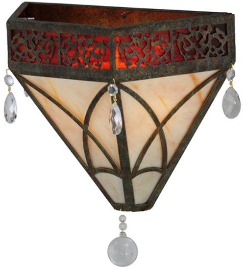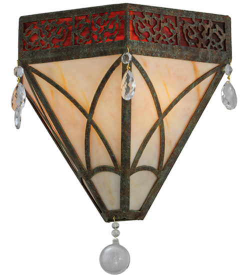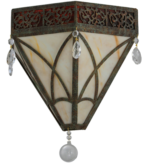 An eclectic elegance evokes with the Larkfield wall sconce. A Travertine Idalight shade features an abstract expressionist pattern and is complemented with a Maduro Idalight trim. Crystal Pendalogues and a Crystal Orb accent adorn this charming fixture. The sconce is handpainted in the Capri finish. Handcrafted by highly skilled artisans in our 180,000 square foot manufacturing facility in Yorkville, New York. Shade colors, metal finishes and sizes can be customized to your specifications. UL and cUL listed for dry and damp locations.