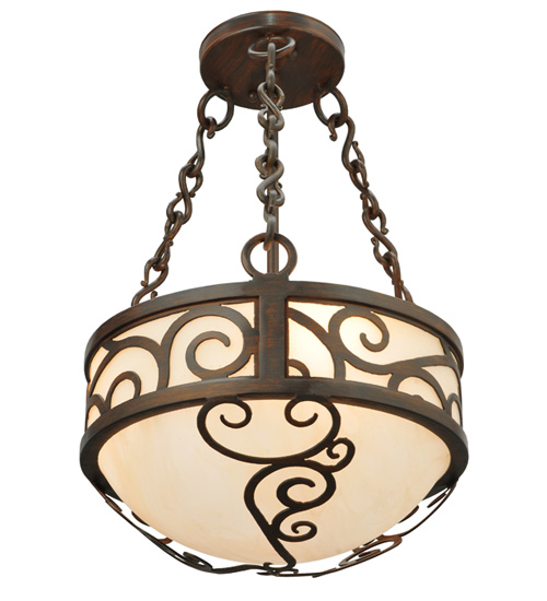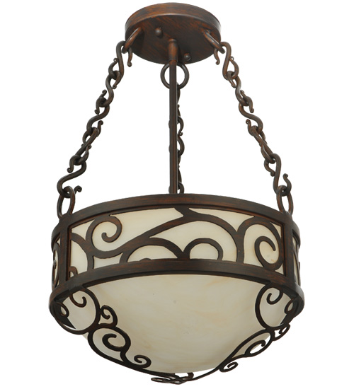 A touch of warm opulence is blended with elegant scroll metalwork that evokes a handcrafted look. This ceiling fixture offers a lovely transitional style featuring stunning Sahara Taupe Idalight. The diffuser is complemented with a Rustic Iron finish. Hand forged Iron chain links match the scrolled design on the fixture. Custom crafted in our 180,000 square foot manufacturing facility in Yorkville, New York. This ceiling fixture is available in custom sizes, styles, and colors. UL and cUL listed for dry and damp locations.