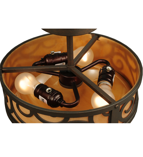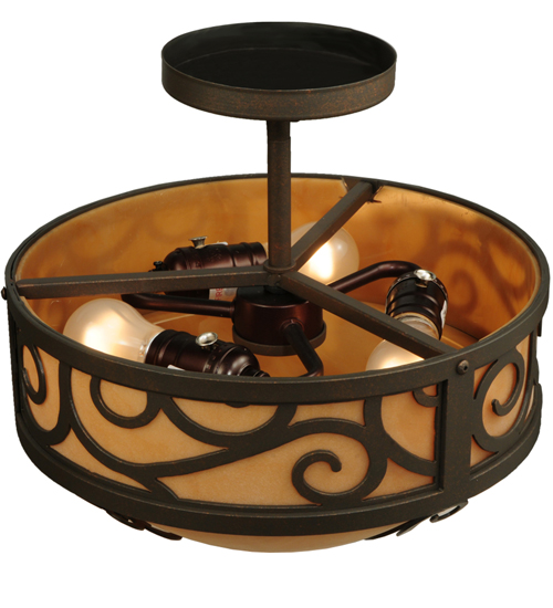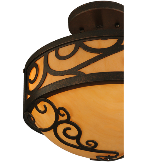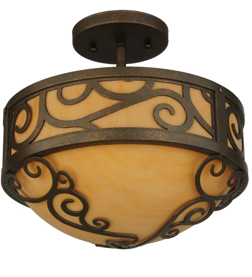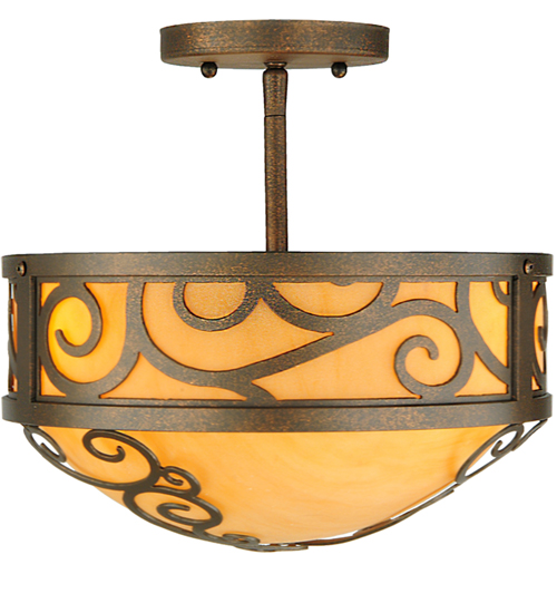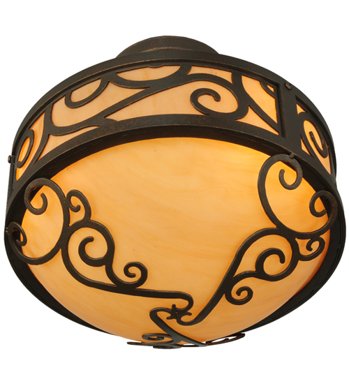 A touch of warm opulence is blended with elegant scrolled metalwork that evokes a handcrafted look. This ceiling fixture offers a lovely transitional style featuring stunning Amber Quartz Idalight. The diffuser is complemented with a Gilded Tobacco finish. Custom crafted in our 180,000 square foot manufacturing facility in Yorkville, New York. Lens colors, metal finishes and fixture sizes can be customized to your needs. UL and cUL listed for dry and damp locations.