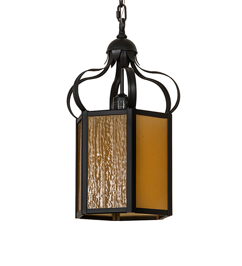 Offering a classic lighting design with beautiful art glass This ceiling pendant is crafted with six panels of Frosted Seeded Amber Glass that diffuse beautiful ambient lighting. The fixture is finished in a bold Solar Black. The overall height ranges from 24 to 98 inches, as the chain length can be easily adjusted in the field to meet your exact specifications. The pendant is ideal for illuminating dining areas and living spaces for houses of worship, homes, hotels, and restaurants. The Mount Carmel Chapel Pendant is included in our American-made, American-designed, handcrafted Transitional Lighting Collection, which is manufactured in Yorkville, NY. UL and cUL are listed for dry and damp locations and featured in Mount Carmel Chapel in La Plata, Maryland.