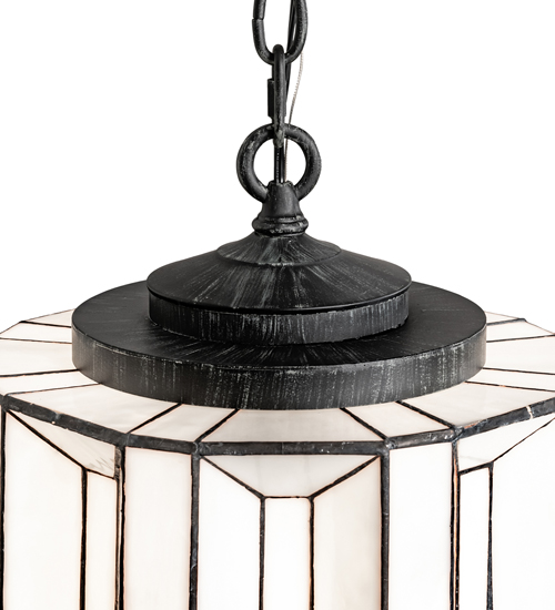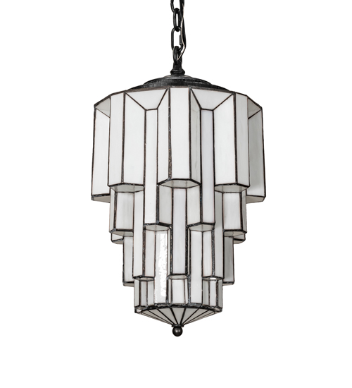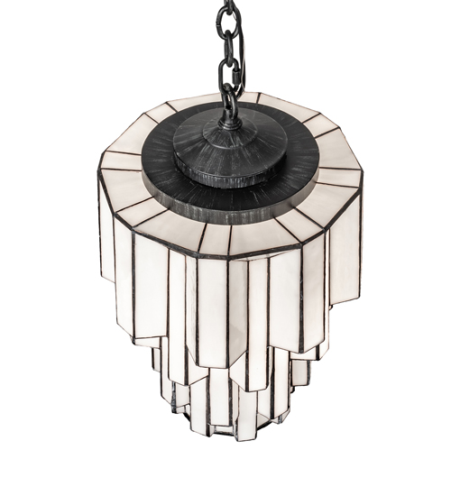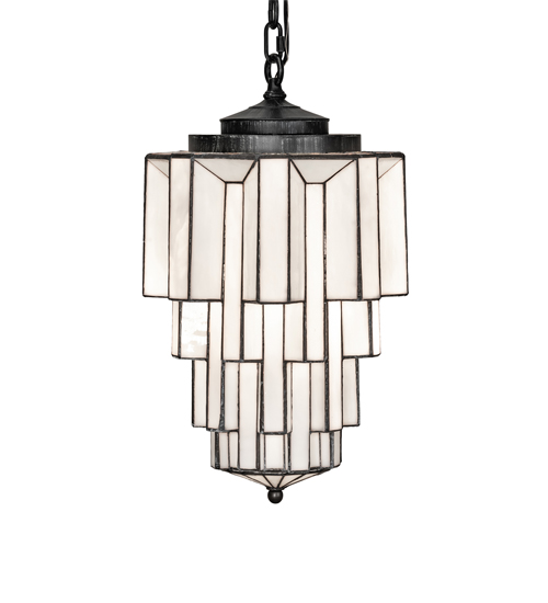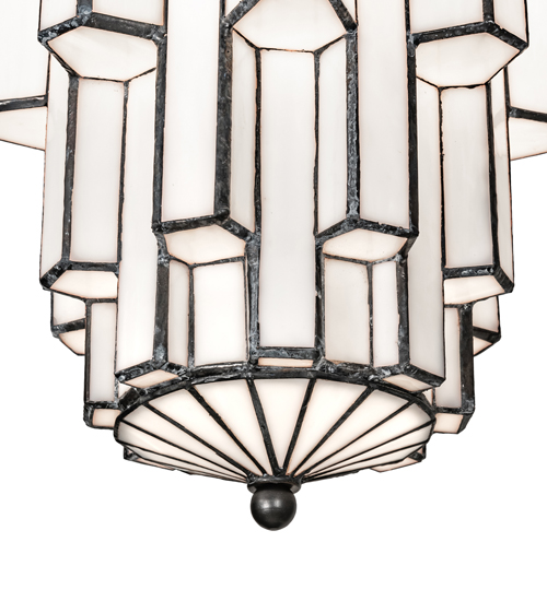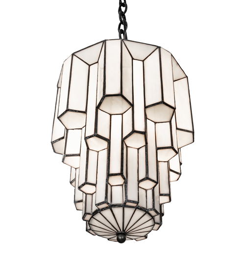 Designed with the glitz and glam of old fashioned movie theaters. Paramount evokes a romantic allusion with a dramatic lighting design that features White Art Glass created using our famous copperfoil construction. Multi layers and levels of enclosed glass towers create an extraordinary dimensional effect. The pendant features an Antique Iron Gate finish. Illuminates with an energy efficient GU24 compact fluorescent lamp (CFL). Overall height ranges from 25 to 54 inches as chain length can be easily adjusted in the field. Handcrafted in our 180,000 square foot manufacturing facility in Yorkville, New York. Diffuser colors, metal finishes and fixture sizes can be customized to your needs. UL and cUL listed for dry and damp locations.