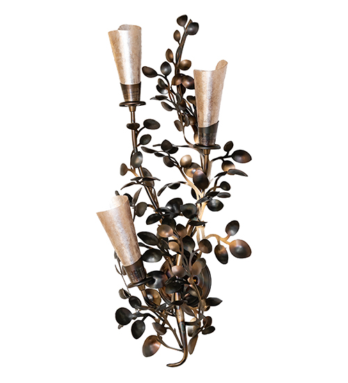 The perfect illuminating decorative accent as a stunning design statement in residential, retail, and hospitality settings. This mesmerizing wall sconce features a beautiful cascading array of three Silver Mica Trumpet Flower shades, with gracefully designed, delicate metal vine and leaves in a Dark Burnished Antique Copper finish. The fixture is ideal for illuminating entryways and corridors. The Vinca Vine 3 Light Wall Sconce is included in our American-made, American-designed, handcrafted Nature Inspired Collection, manufactured in Yorkville, New York. The fixture is UL and cUL listed for dry and damp locations.