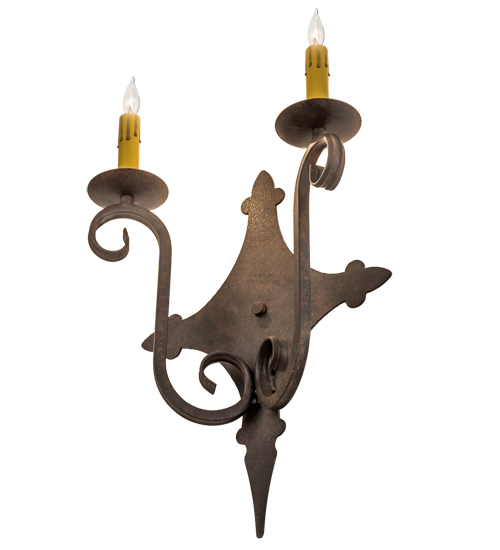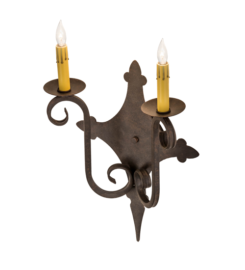 Rich charm and elegance come to light with Angelique, a two-light wall sconce designed as a dramatic accent for a hallway, entryway or any other room in residential and commercial settings. This enchanting wall fixture features two Amber faux candlelights perched on bobeches with scrolled arms and decorative hardware featured in a Cajun Spice finish. Custom crafted by highly skilled artisans in our 180,000 square foot manufacturing facility in Yorkville, New York. Custom colors, styles and sizes are available, as well as dimmable energy efficient lamping options such as LED. UL and cUL listed for damp and dry locations.