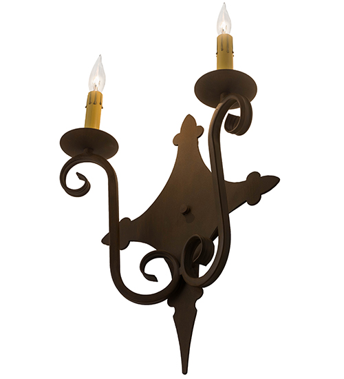 Rich charm and elegance come to light with Angelique. This 2-light wall sconce designed as a dramatic accent for a hallway, entryway or any other room. This enchanting wall fixture features Ivory faux candlelights that are perched on bobeches. Hand Forged Iron scrolled arms and stylized diamond shaped hardware feature a Rustic Iron finish. Handcrafted by highly skilled artisans in our 180,000 square foot manufacturing facility in Yorkville, NY. Available in custom sizes, styles and finishes. UL and cUL listed for dry and damp locations.