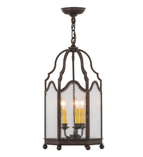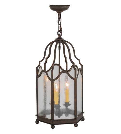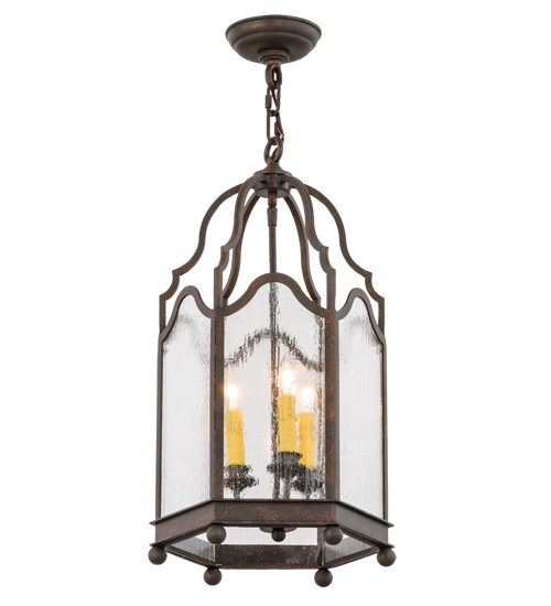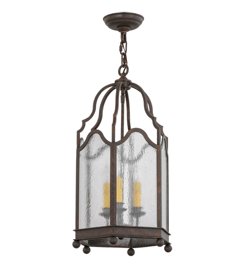 A charming pendant for a variety of settings, Antencio achieves a new level of quality and attention to detail with Clear Seedy glass that reveals three Amber faux candlelights. The pendant is designed with a decorative frame and hardware featured in a warm Gilded Tobacco finish. The fixture is custom crafted by skillful artisans in our 180,000 square foot manufacturing facility in Yorkville, New York. Dimmable energy efficient lamping options such as LED, as well as custom sizes, styles and colors, are available. The pendant is UL and cUL listed for damp and dry locations.