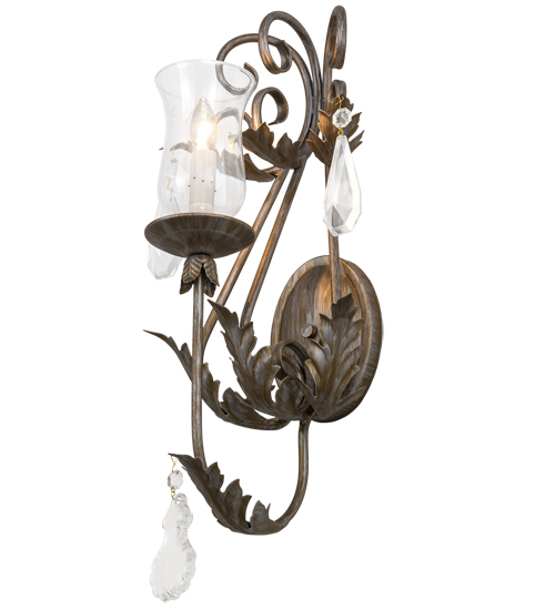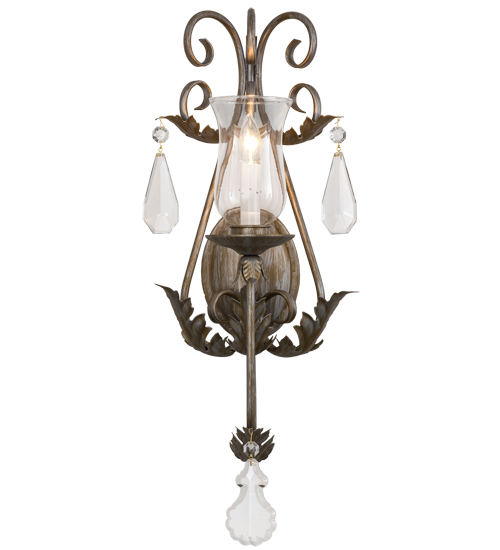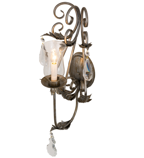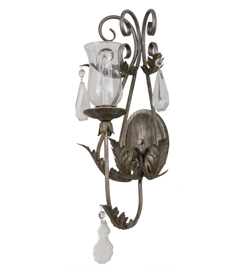 A luxurious sconce design comes to light with elegance and glamour.An Ivory Faux candlelight covered with a Clear Glass Hurricane shade is perched on a fanciful bobeche and embraced by an exquisite Acanthus leaf accented arms with large Crystal Pendalogues and faceted Crystals. The decorative accents, frame and hardware are featured in an Antique Silver finish.This lovely wall fixture is handcrafted in our facility in Yorkville, New York.Custom sizes, styles, colors and dimmable energy efficient lamping options are available.The wall fixture is UL and cUL listed for damp and dry locations.