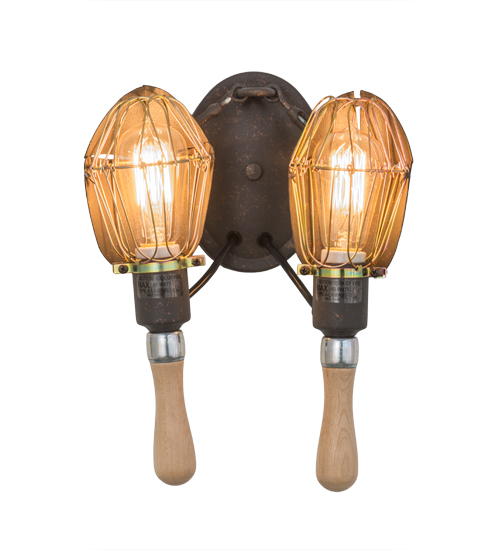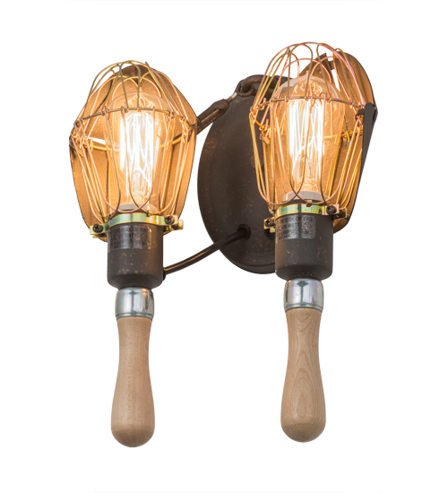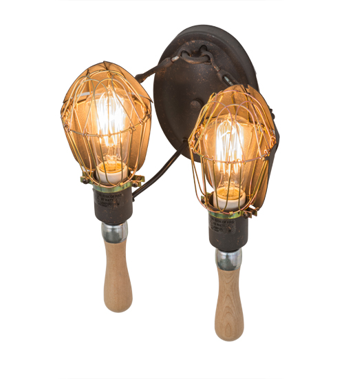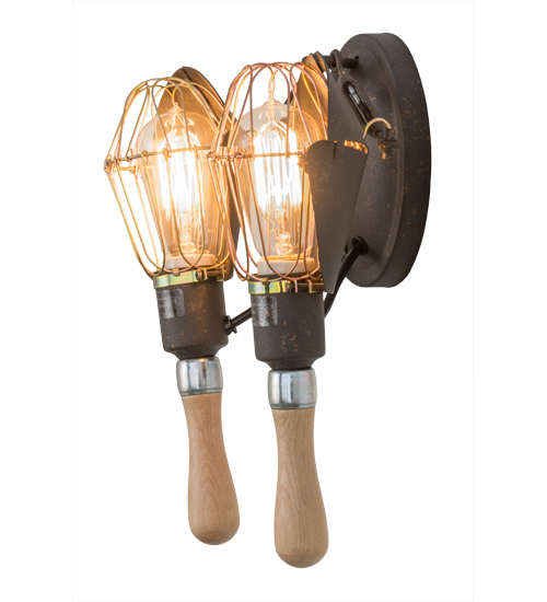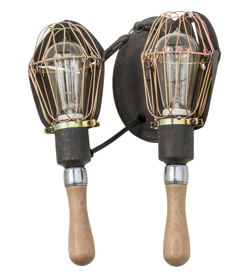 Emancipate your design freedom with this dramatic cage frame with exposed lamp display from within. Although the bulbs appear caged, the illumination and unique aesthetic appeal are not. The simplistic design of this mechanical lamp style is complemented with wooden handle and accents. The fixture is enhanced with an applied Copper Rust finish on the frame and hardware that houses Edison incandescent bulbs. The round backplate and arm are featured in a matching finish. Handcrafted by artisans in our manufacturing facility in Yorkville, NY. Custom styles, sizes, and colors are available as well as dimmable energy-efficient lamping. This fixture is UL and cUL listed for damp and dry locations.