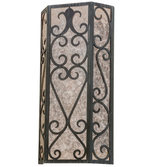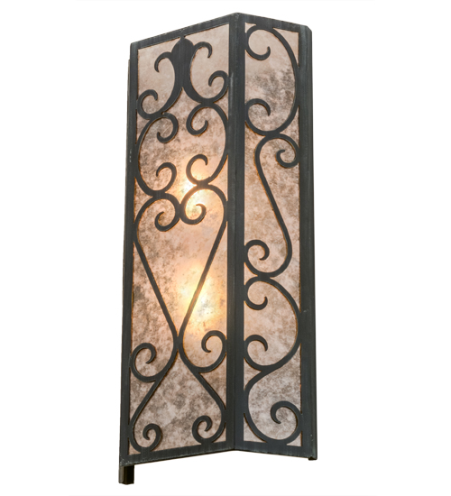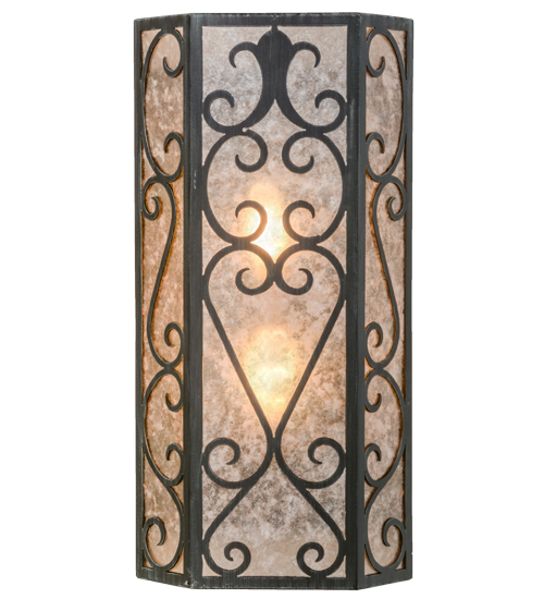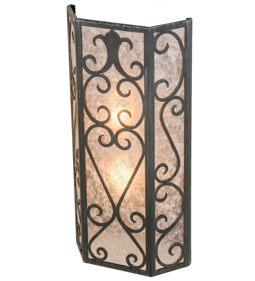 Expert craftsmanship and a distinctive elegance come to light with a luxurious wall sconce that entices all to see. An exquisite Silver Mica diffuser is enhanced with a frame, hardware and intricate scrolled accents featured in an Antique Iron Gate finish. The wall fixture is custom crafted in the USA with highly skilled artisans. Custom styles, designs, colors and dimmable energy efficient lamping options such as LED are available. The sconce is UL and cUL listed for damp and dry locations.