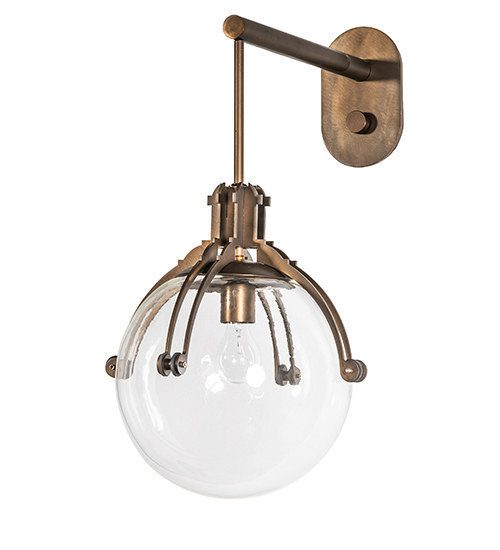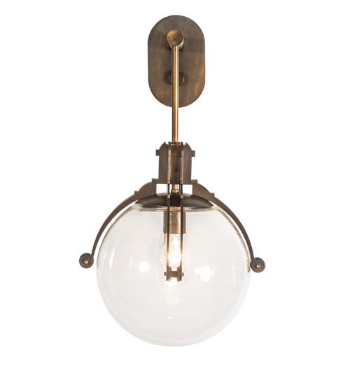 This unique hanging wall sconce integrates an Art Deco design with an intriguing Industrial Look. The Clear Glass Orb reveals an Edison-style lamp with a bracket-style metal frame featured in an Antique Copper finish. This stunning wall fixture is perfect for placement in corridors and other areas in residential and hospitality settings. It matches well with our 46-inch wide 3 Light wall sconce (model 26543) and complements the 30″ Wide Kasteel Pendant (model 267494). The Bola Bretelle Wall Sconce is included in our American-made, American-designed, handcrafted Industrial Lighting Collection and manufactured in Yorkville, New York. UL and cUL listed for dry and damp locations.