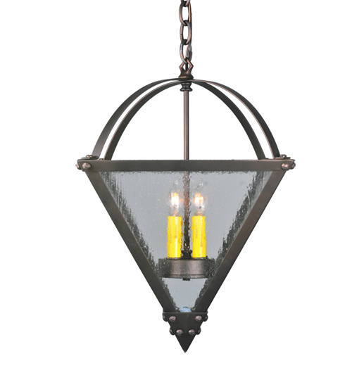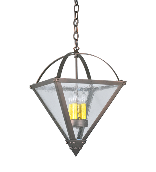 A sophisticated, inverted pyramid-styled fixture is designed with a unique, fresh, and stylish pizazz. Give your decor an edge with this breathtaking fixture, highlighted with a solid structure. Beautiful ambient illumination is delivered by four Ivory faux candlelights, which can be seen through a Clear Seeded Glass lens. The hardware and frame are featured in a handsome Mahogany Bronze finish. It is ideal for placement in foyers and entryways. The overall height ranges from 25 to 51 inches, as the chain can be easily adjusted in the field depending on customer requirements. Perfect for homes from New York to Salt Lake City, Utah, to Los Angeles. The Pyramid Inverted Pendant is included in our American-made, American-designed, handcrafted Transitional Lighting Collection and manufactured in Yorkville, New York. UL and cUL listed for dry and damp locations.