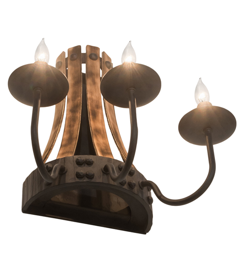 A Hand Hammered metal banded belt finished in Costello Black embellishes this breathtaking wall sconce. The sconce features Metal Staves that are Hand-Painted to look like wooden staves traditionally bound in the construction of beer/whisky barrels and wine casks. Three Complementary faux candlelights with delicate bobeches are embraced by curved arms. Ideal for providing beautiful decorative lighting in lobbies, ballrooms and large spaces in homes, hotels, retailers and other commercial locations. Handcrafted in our 180,000 square foot manufacturing facility in Yorkville, NY. Fixture designs, metal finishes and sconce sizes can be customized to meet your needs. UL and cUL listed for damp and dry locations.