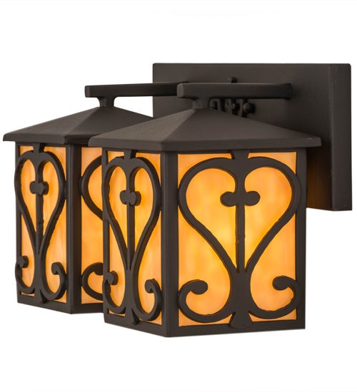 A dramatic dual lighting design featuring ornate hand-forged metalwork that creates a rich, luxurious look for Caprice. This high-styled wall fixture features Beige Flemish art glass, which is enhanced with exquisite scrolled accents in a Wrought Iron finish. This two-lantern sconce is ideal to complement a variety of architectural styles in fine baths, corridors, and other rooms. Custom crafted in the USA, this fixture is offered in custom sizes, finishes, and styles, as well as energy efficient lamping options such as LED. The fixture is UL and cUL listed for dry and damp locations.