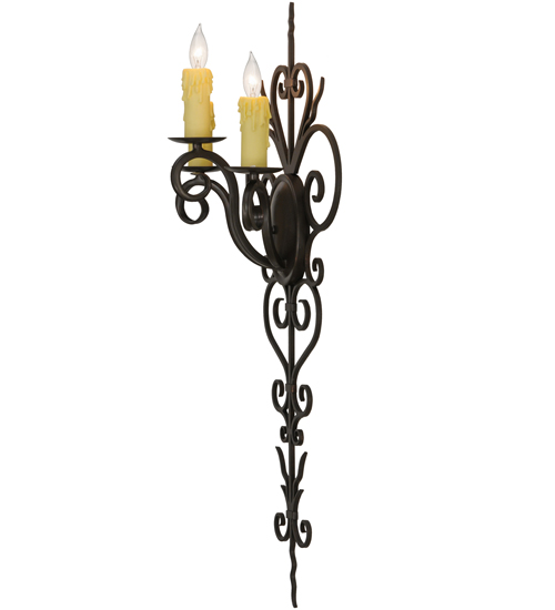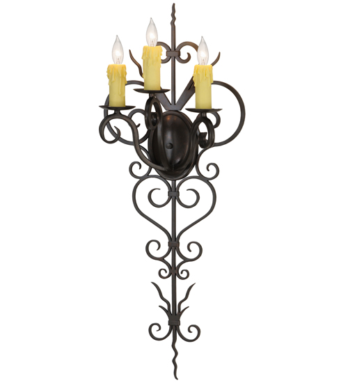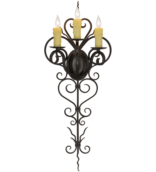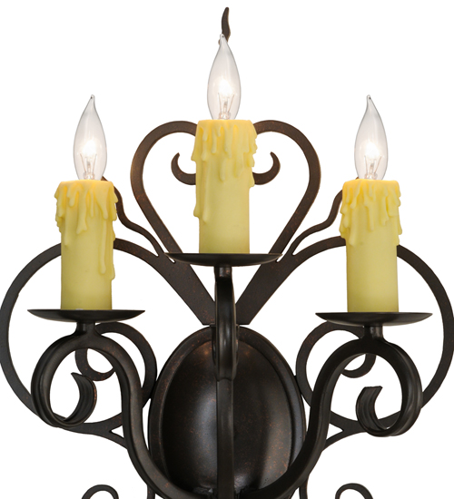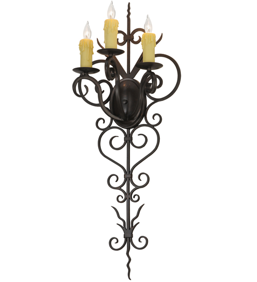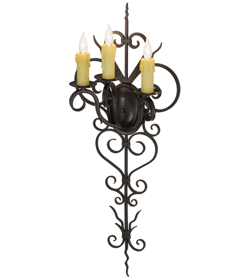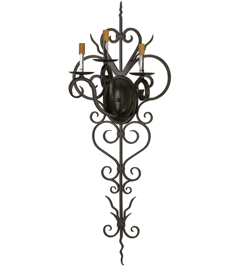 Rich charm and elegance come to light with Kenna. This exquisite sconce is designed as a dramatic illuminating accent for a wall in any room in residential, hospitality and commercial environments. This enchanting fixture features three Ivory faux candlelights perched on bobeches. Exquisite Hand-Forged Iron Scrollwork is featured in a Gilded Tobacco finish. Handcrafted by highly skilled artisans in our 180,000 square foot manufacturing facility in Yorkville, New York. Candlelight colors, metal finishes and fixture sizes can be customized to your needs. UL and cUL listed for dry and damp locations.
