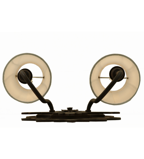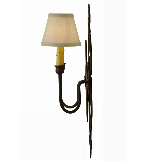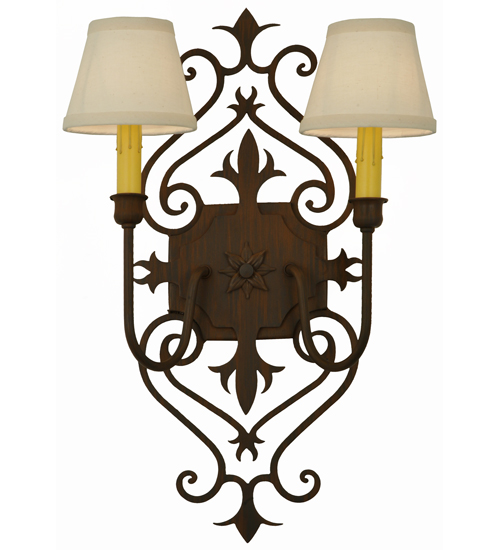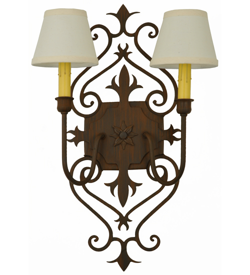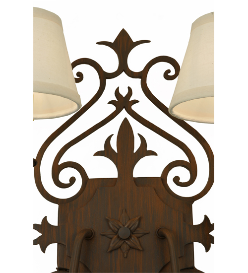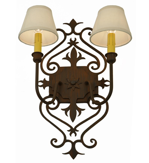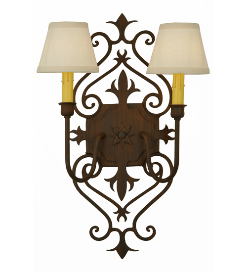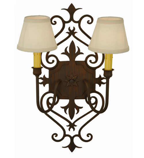 Gothic revival combined with a Fleur-de-lis-inspired motif. Romantic elegance is captured with Rustic Iron finished accents and frame. The ornate hardware is enhanced with Two White Textrene Shades that crown Ivory faux candlelights perched on complementary bobeches. The exquisite wall fixture is ideal for hallways, living spaces, and other rooms in residential, hospitality, and commercial environments. Inspired by French design movements from Marquette, Michigan, to New Orleans, Lousiana, to Dubuque, Iowa. The Louisa Wall Sconce is featured in our American-made, American designed handcrafted French Lighting Collection. Manufactured in Yorkville, New York. UL and cUL listed for dry and damp locations; however, we do not recommend installing it in spaces that experience a large amount of moisture due to the fabric shades.