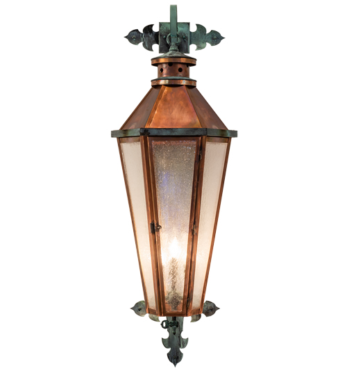 A classic elegant lantern design custom crafted of Vintage Copper finished Brass and Verdigris finished accents and backplate. The Millesime Lantern features a unique, luxurious look for interior and exterior environments. This high-styled wall fixture offers a Clear Seeded Glass Lens. Ideal for placement in foyers, entryways, and facades in residential, hospitality, and commercial spaces. Inspired by classic lighting fixtures in landmark buildings and houses of worship from Washington, D.C., To Savannah, Georgia, to San Antonio, Texas. The Millesime Lantern Wall Sconce is featured in our American-made, American-designed, handmade Traditional Lighting Collection and manufactured in Yorkville, New York. UL and cUL listed for dry, damp, and wet locations.