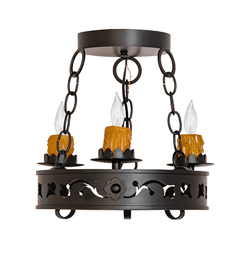 Custom crafted for the King or Queen in your castle, Sagebrush presents a touch of warm opulence blended with handsome rustic styling. This chandelier offers an extraordinary transitional style as sparkling illumination evokes from 3 stunning Amber faux candlelights that adorn the perimeter of this Solid Steel ring with floral and scroll accents in a Blackwash finish. This fixture will make a design statement as a centerpiece in any room including an entryway, dining room, lobby, conference room and other locations. Handcrafted by highly skilled artisans in the USA, this fixture is available in custom sizes, styles, colors and dimmable energy efficient lamping options including LED. Sagebrush is UL and cUL listed for dry and damp locations.