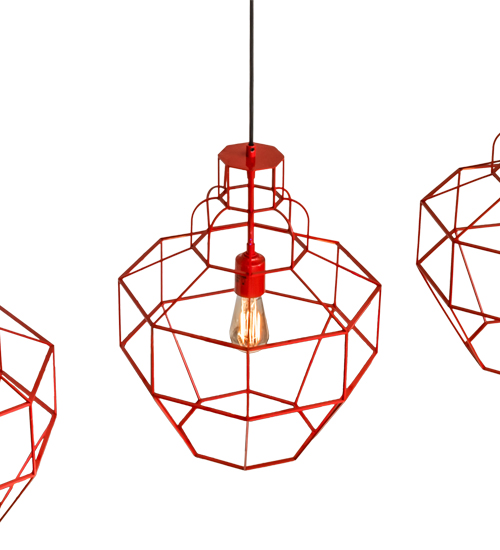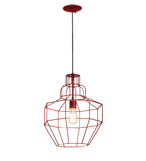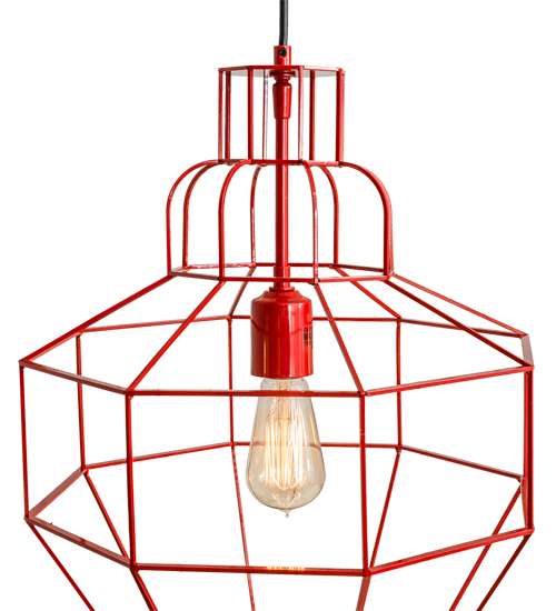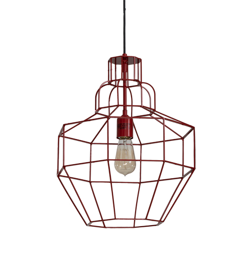 Inspired by the complex profile of industrial lights and fans, this traditional pendant shade makes for an elaborate display. This curvaceous metal wire cage-like pendant reveals a single Edison-style lamp that evokes beautiful ambient illumination. The frame and hardware are shown in a brilliant Red Ruby metal finish. This fixture is ideal for utility rooms, workspaces, dining areas, and espresso bars. The overall height ranges from 23 to 82 inches, as the suspension cord can be adjusted in the field. This item is the single light pendant version of 213578, the 156″ Wide Troy 8 Light Pendant. The Troy Pendants are featured in our American-made, American-designed, handcrafted Industrial Lighting Collection. UL and cUL listed for dry and damp locations. The pendants are featured at MEDICI Roasting in the Austin-Bergstrom International Airport.
