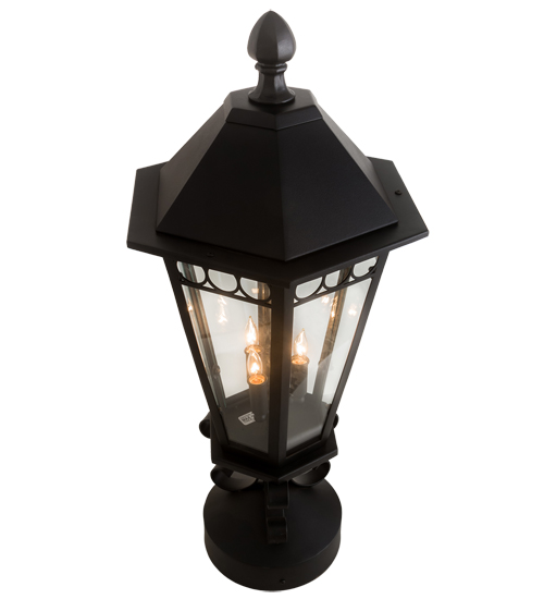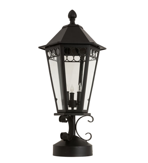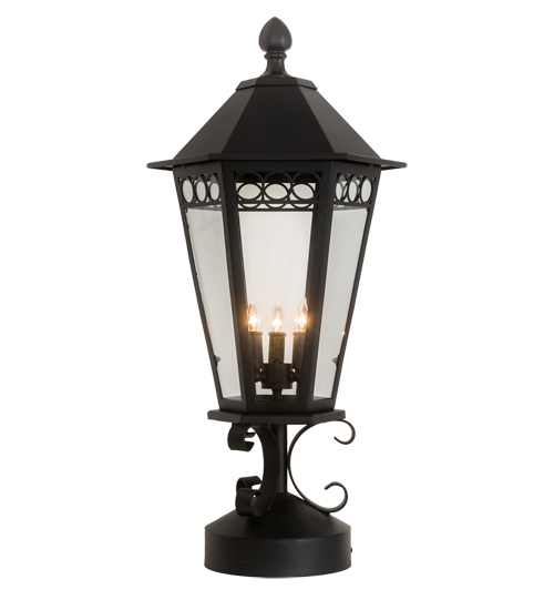 A classic lantern design for ages. Yorkshire is ideal for illuminating your interior or exterior space. Custom crafted of steel, the Handforged scrollwork, frame and hardware are finished in a Textured Black hue. A Clear Glass lens reveals three complementary faux candlelights that illuminate from within to enhance columns, posts and decks in residential, hospitality and commercial settings. This stunning fixture is handmade by skilled artisans in our 180,000 square foot manufacturing facility in Yorkville, New York. Custom sizes, styles and finishes available. UL and cUL listed for dry, damp and wet locations.