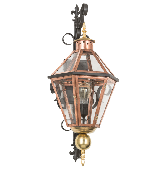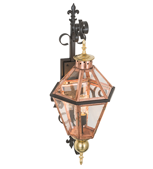 Grand stature and exquisite metalwork are combined to create a sophisticated, luxurious look for Millesime. This high-styled wall fixture features Clear Glass, which is enhanced with Copper and Brass hardware and complemented with a Timeless Bronze finished scrollwork and backplate. An Edison style lamp provides ambient illumination from within the lantern. This sconce is ideal to complement a variety of architectural styles for today’s fine exteriors and interiors. Handcrafted in the USA, this fixture is offered in custom sizes, finishes, styles and energy efficient lamping options such as LED. UL and cUL listed for dry, damp and wet locations.